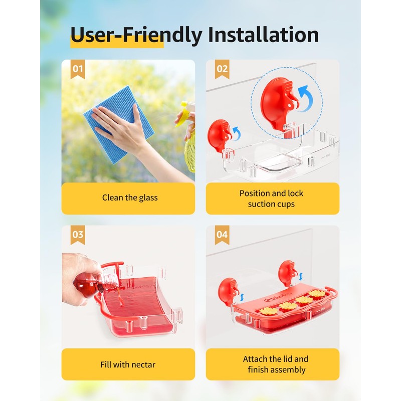 - 【Easy to Refill and Clean】The structure of this hummingbird feeder window is very simple. Simply remove or attach the lid to fill in the nectar or clean the feeder. The hummingbirds can enjoy fresh and clean nectar owing to the easy cleaning of feeder, promoting their overall health.