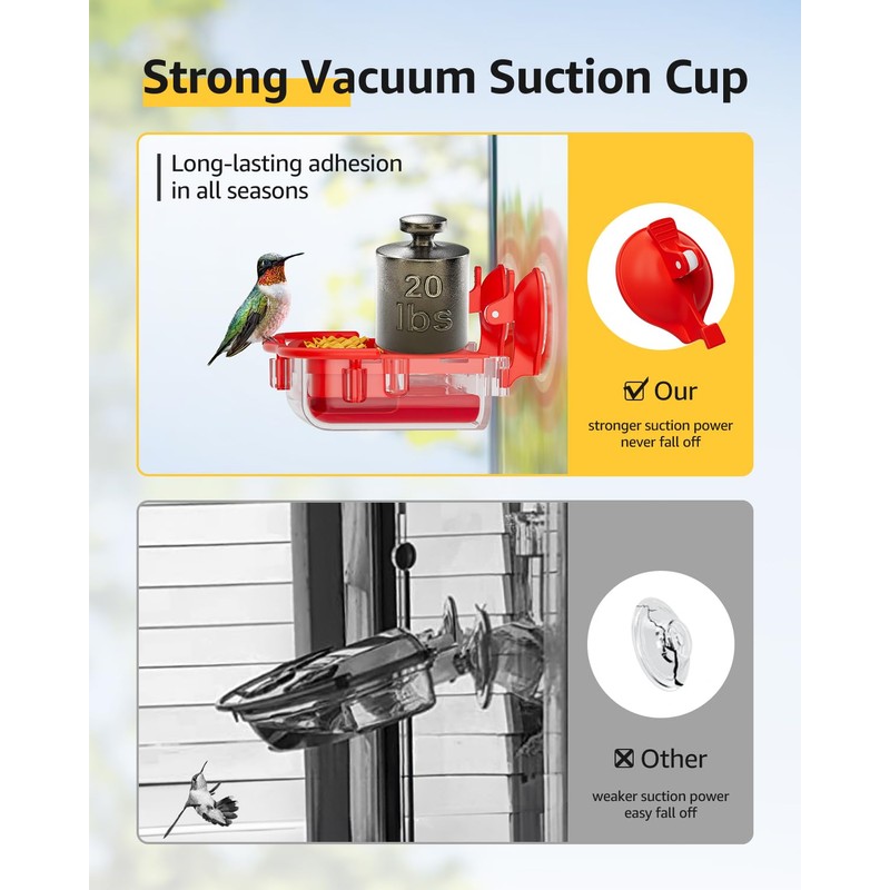 - 【Strong Vacuum Suction Cups】The hummingbird window feeder is equipped with 2 strong suction cups for secure mounting on windows, ensuring it never falls in all seasons, which provides hummingbirds with a more secure place when feeding and resting.