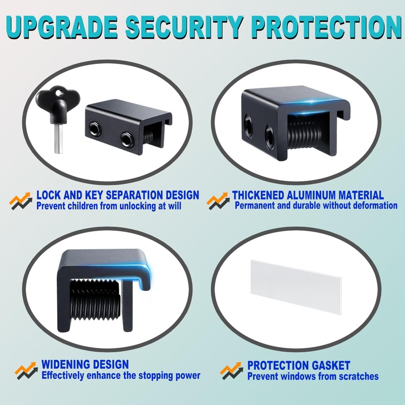 • 【ENHANCED SECURITY DESIGN】2024 Upgrade protection design:1, window lock and key separation design, to prevent children or thieves to unlock at will; 2, thickened aluminum alloy material, permanent durability and not deformed; 3, window lock two fixed hole design, so that you can experience a stronger security protection; 4, the lock body widening design, open the window when the blocking area is more solid; 5, the window lock is equipped with a protective washer, to prevent scratches or damage to the window.