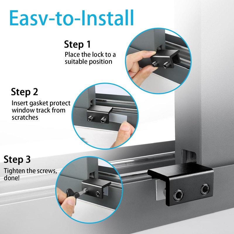 • 【EASY TO INSTALL WITHOUT DRILLING】No additional tools or drilling required for installation. Just three steps: 1. Place the window lock on the window track, 2. Insert the washer to protect the window track from scratches, 3. Finally tighten the screws and you're done! You can easily reinstall the lock in different locations using a vertical key or hex key, making window lock reuse simple and convenient.