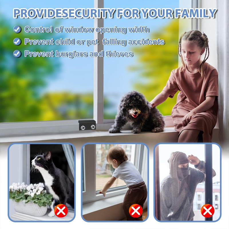 • 【VERSATILE USABILITY】It ensures your family members safety. Our sliding window security locks are widely used in a variety of situations, including homes, apartments, hotels, offices and more. The window lock can freely control the sliding window to partially open or completely close, effectively reduce the risk of children and pets falling from high windows, preventing burglars and thieves from trespassing, the window security locks can provide you with more safety protection.