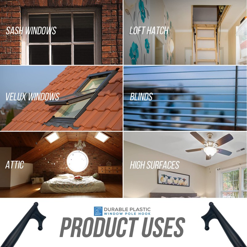 - Multifunctional – Works perfectly for high-hanging rails and is made for reaching high surfaces with ease. This velux pole to open window can also be used for wardrobe and closet where clothes hangers can effortlessly lift or put back. The window hook pole is also handy to control the blinds with handlebars and can access or retract your loft ladder.