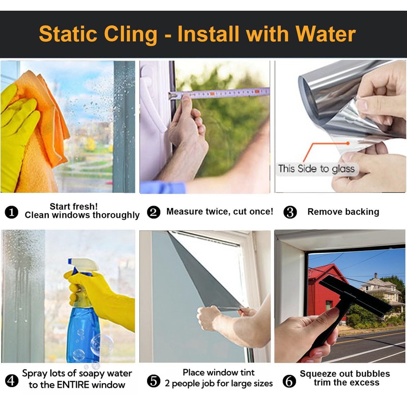 - STATIC CLING & NO MESS NO FUSS INSTALLATION: This removable window tint has no glue or chemical substances, which makes it easier and safer to install or remove without any trace left on glass. In addition, we provide complementary tools save you money and trouble - please look for them inside of the film roll. if any is missing, please contact us. For smooth application, make sure window surface is completely clean and spray A LOT of soapy water on both the adhesive side and the window.
