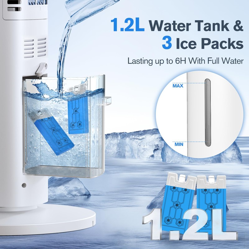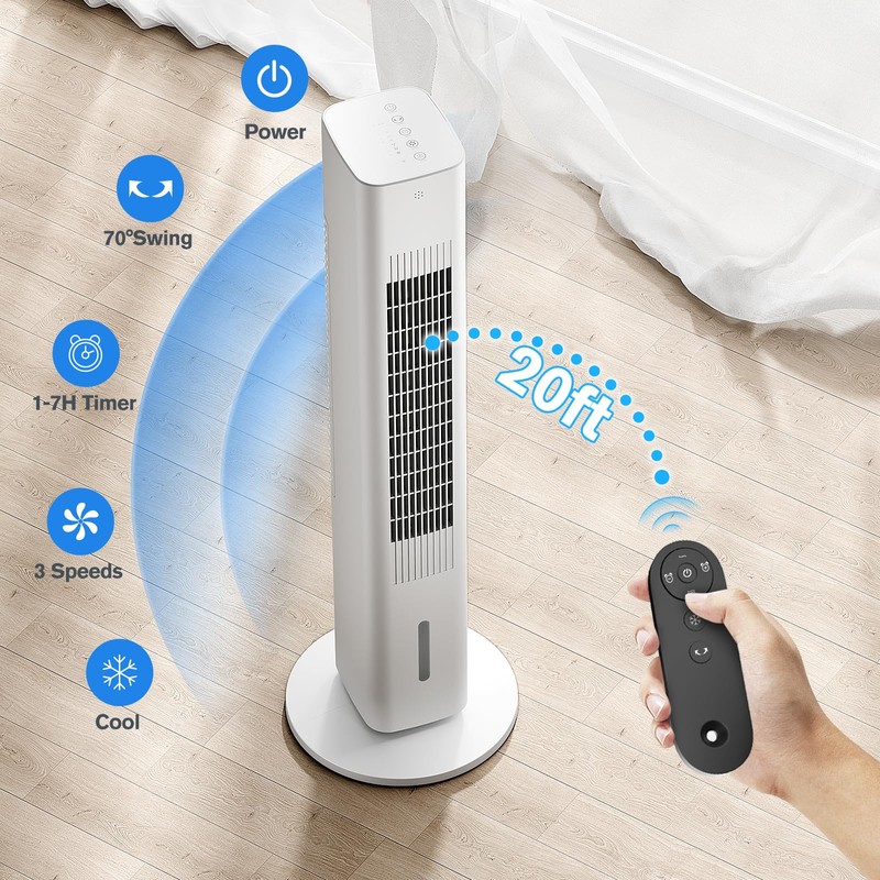 Windowless Portable Air Conditioners, 35’’ Cooling Tower Fan w/Remote, 7H Smart Timer & 70° Swing, 1.2L Water Tank With 3 Ice Packs, Ductless Air Cooler For Home Bedroom Office