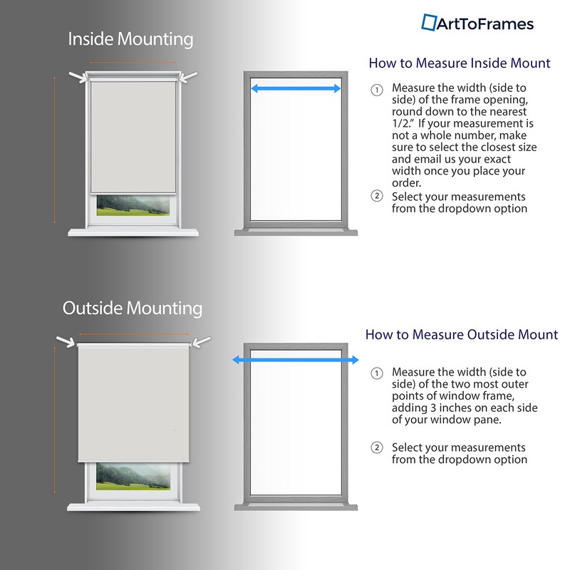• Our Roller Shades can be mounted via an inside OR outside mount. Please see description below for detailed instructions on how to measure your window.