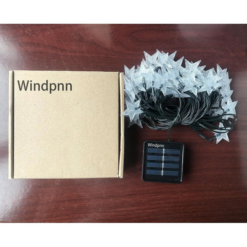 **Tips:** * During the daytime, solar panel converts sunlight to electrical energy stored in the rechargeable battery * Turn the switch on and set light mode before charging the solar power, so it will light up at dusk * The solar star string lights should be fully charged by direct sunlight for 6-8 hours before initial use **Specifications:** * Wire material: Plastic * Wire Color: Black * LED Count: 50 pcs * Light Color: warm white * Light Mode: 8 Modes * Waterproof: IP65 * Lead Wire Length: 6.56ft/2 Meters * Total Length: 30.6 ft/9.35 Meters * Space Between LEDs: 5.9 inches/15 cm * Star Diameter : 1.6 inches/4cm * Power Source: Solar * Working Voltage: 1.2V * Weight: 0.26kg **Package include:** 1 x 50 LED Warm White Solar Christmas Star Lights Strand 1 x Solar Panel and Stand