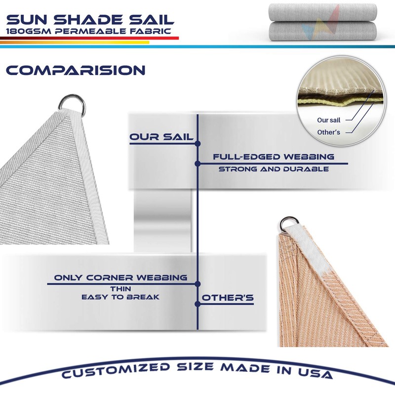 **Important:** Our customized sunshade sails are made case-by-case, and cannot be resold. Please carefully measure your space, and choose the correct size for your needs.