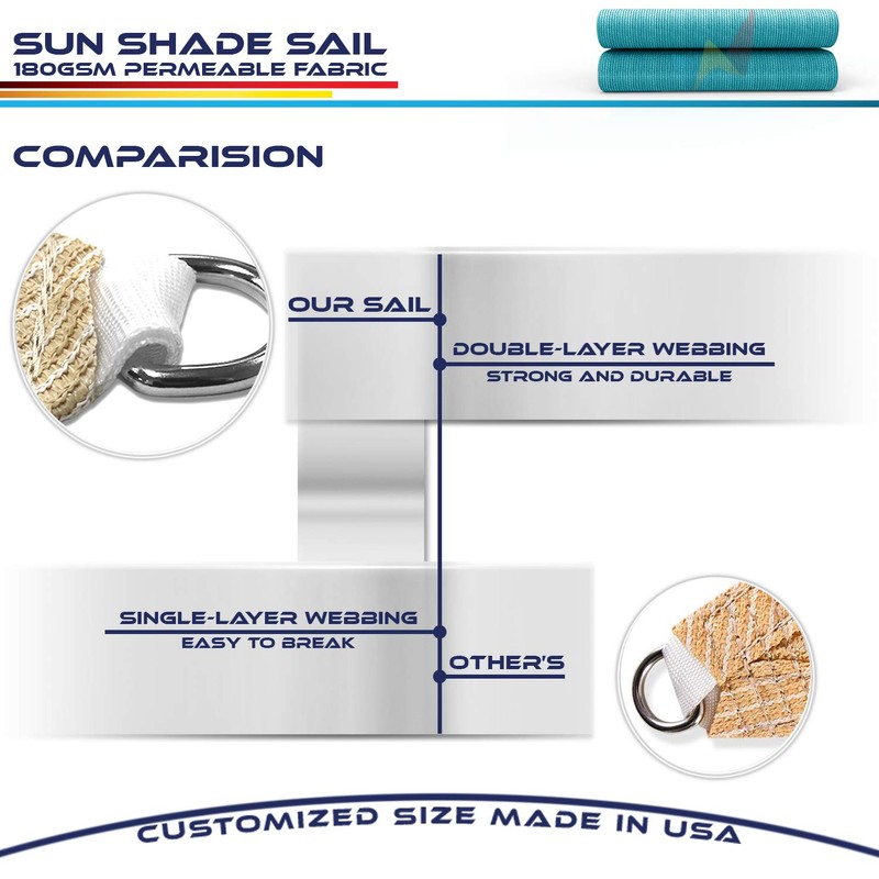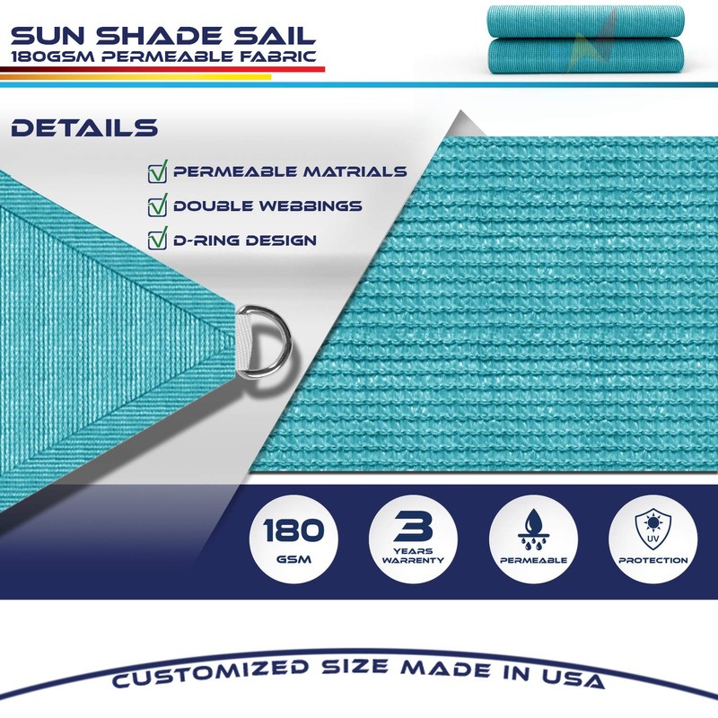 This Sun Sail / Flexible Garden Shade is constructed of high-quality sun screen fabric, which allows refreshing breezes to flow through. The sail can be easily hung over a patio, driveway or other outdoor space to provide shade and protection from up to 90% of the sun's harmful UV rays. **Important:** Our customized sunshade sails are made case-by-case, and cannot be resold. Please carefully measure your space, and choose the correct size for your needs.