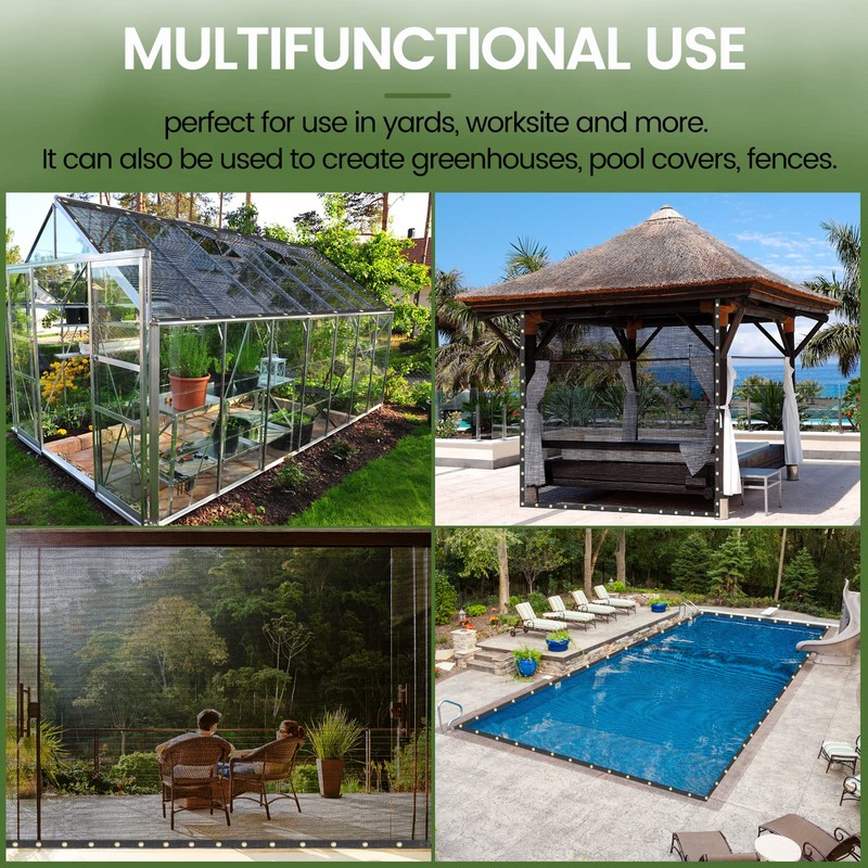 - MULTIPURPOSE: This Shade Tarp blocks 60-70% of the light, making it perfect for use in yards, worksites, pool decks, and more. It can also be used to create greenhouses, pool covers, fences, and even mosquito nets.