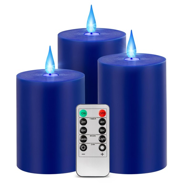 Windshell Blue Flickering Flame Candles (Blue LED Light Source), 3D Wick Design/Battery Operated, Real Wax Flameless Blue Pillar Candles, Remote Control with Timer and Dimmable