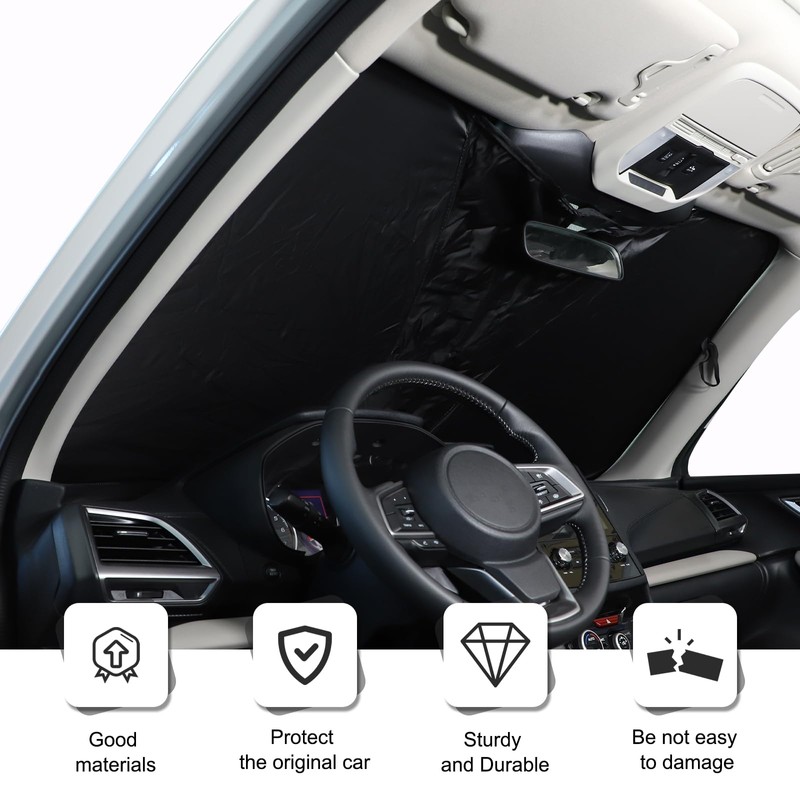 • ☀High Quality Material: The front windshield is made with UV reflective material, two -layer heat insulation and 99% SPF, reducing heat buildup by up to 40°F and blocking of harmful UV rays. Keep your car cooler and prevents leather seats from cracking and fading. This sun visor is essential for sun and UV protection year-round
