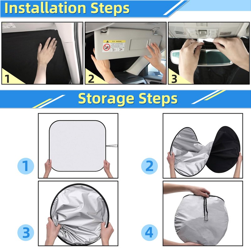 • Sunshade Shield Protector - Our Sun Visor Protector is easy to install in just minutes, no modification require, fit snugly and stay fit without falling. With elastic memory steel wire, it is easy and convenient to store when you don't need to use it. You can easily tuck the windshield shade in your car with storage bag it comes with