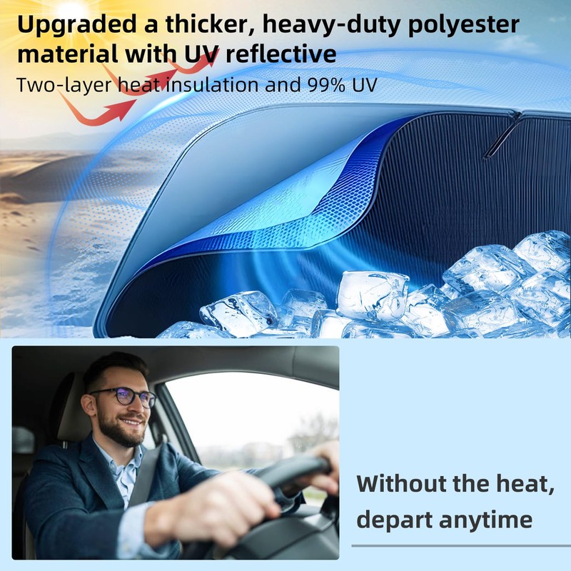 • Upgrade Material - The car sunshades have upgraded to a thicker, heavy-duty polyester material with UV reflective, two-layer heat insulation and 99% SPF, designed to keep your vehicle cooler and enhance heat insulation, ensuring a more comfortable driving experience