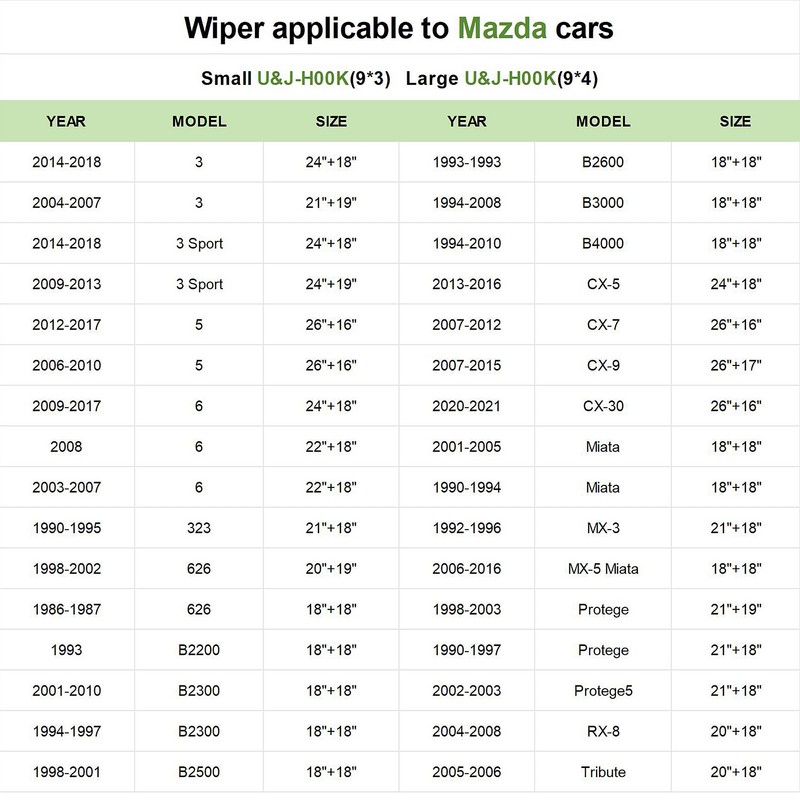 - 【Japan imported Fugoku rubber strips】This size windshield wiper for Mazda 3 2004-2007|Protege 1998-2003 | Protege5 2002-2003.After undergoing 321 hours of continuous reliable scraping tests, the windshield wipers ensure long-lasting use without deformation while maintaining silence and providing improved durability.