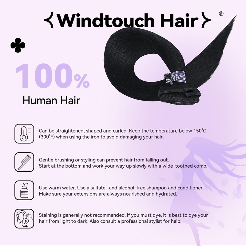 - 【Clip in hair extensions for women Tips】-- Properly care for hair extensions to maintain smoothness and shine. Use mild shampoo and conditioner. When dyeing, it is recommended to dye darker colors, and it is not recommended to dye light colors. Please control the temperature below 180℃ when re-styling. Hair extensions can last approximately 3-4 months with good care.