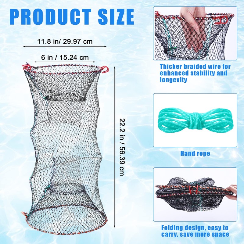 • Crab Net: our crawfish trap uses thick galvanized steel bars as circular spring cages, and the polyethylene mesh fabric has stability and durability; The top entrance size is about 11.81 inches/ 30 cm, and the length is approximately 23.62 inches/ 60 cm, which can help you capture the prey you want more easily