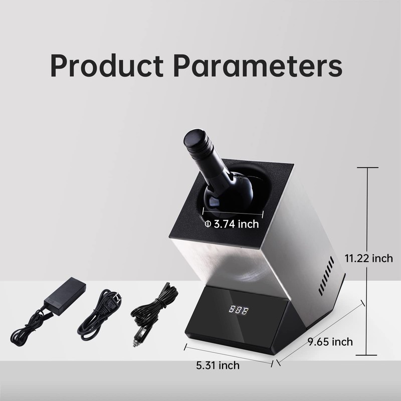 - Easy and Convenient to Use- Step1: Turn on the wine bottle chiller. Step 2: Set the temperature. Step 3: Place a suitable bottle (less than 3.74” in diameter) in the wine chiller. Step 4: The device begins to cool down. The LED will flash until the set temperature is reached. After that, it will be continuously illuminated.No longer need to add ice to wine glass.