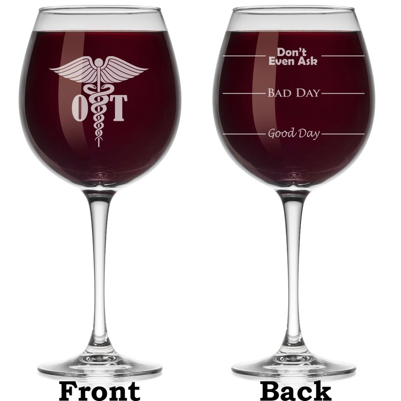 Wine Glass Mood Fill Lines OT Occupational Therapist. Good Day, Bad Day, Don't Even Ask. If you're looking for that perfect gift for the Occupational Therapist in your life Or Something. Dishwasher safe, permanently etched glass.