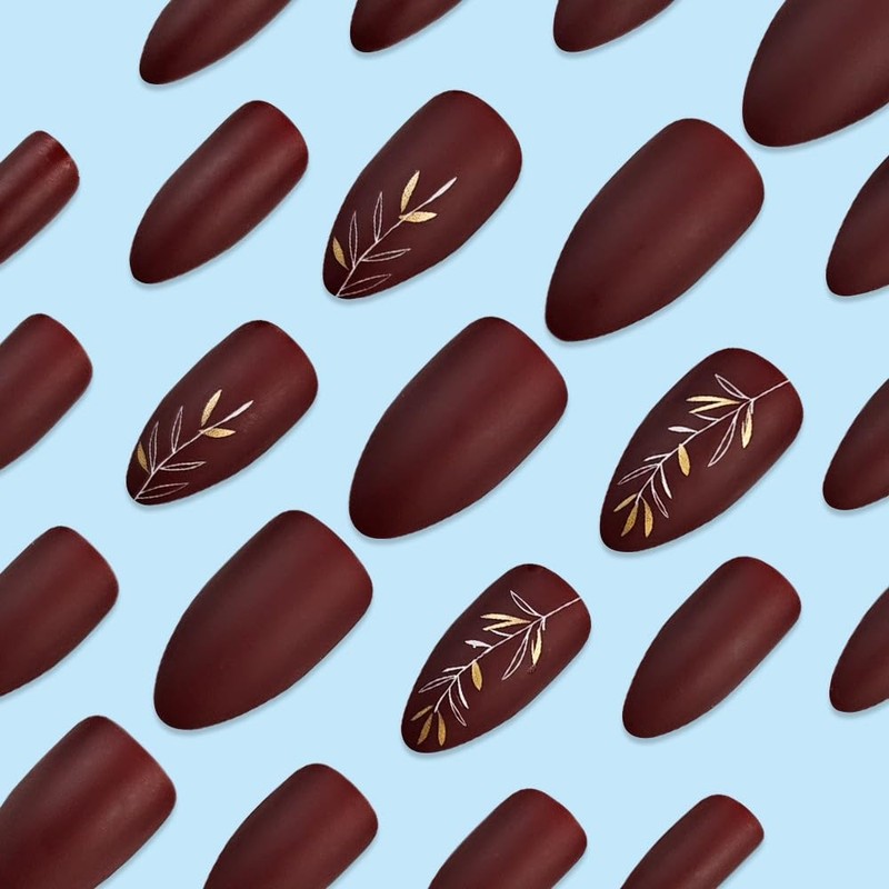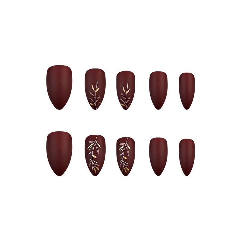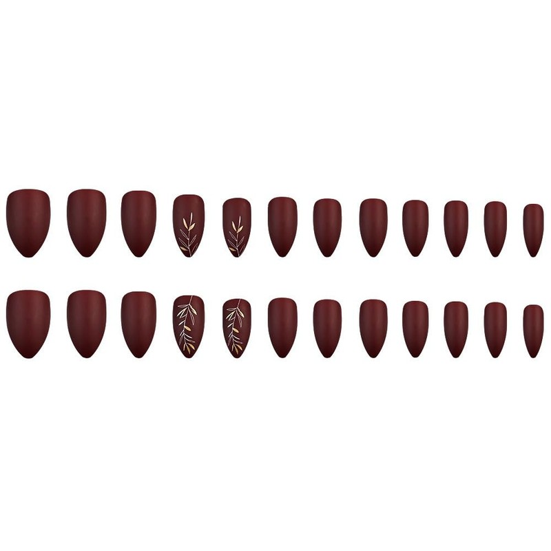 Wine Red Fake Nails Almond Press on Nails Medium Length Acrylic Nails Spring False Nails with Gold Leaves Designs Matte Glossy Artificial Reusable Glue on Nails for Women Girls 24Pcs