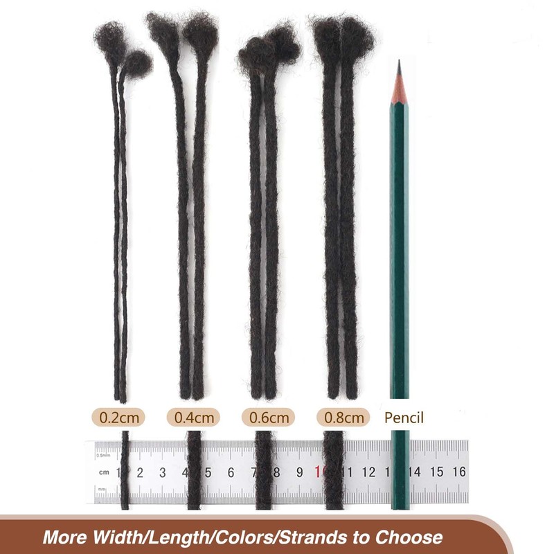 - 【Human Dread Extensions】Width: 0.2 0.4 0.6 0.8cm. Length: 6-18Inch. Strands: 10 20 30 60 100. Colors: 1B,4,27,30,350,613,99J,Blue,Purple;T27,T30,T350,T613,T99J,Tblue,Tpurple. Tools: 1 Comb, 1 Crochet Hook, Some Colorful Rings. All Lock Extensions Will be Double Checked and Well Packed.