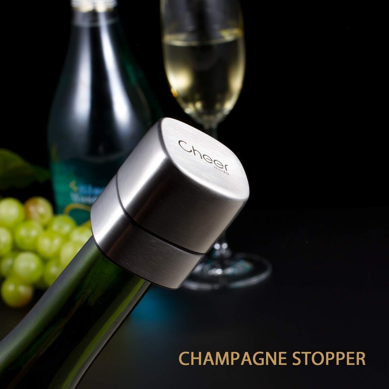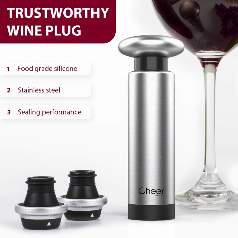 - ''' Keeps wine and champagne fresh: This Cheer wine pump & stopper set can help create an airtight vacuum that preserves wine and champagne once the bottle has been opened#||# Tight vacuum & great durability prevents the oxidation process that is responsible for the deterioration of wine and champagne; can keep wine fresh and savory for up to seven days#||# Uniform & modern/upscale design: contains one pump with stainless steel top and body, two wine stoppers with date markers, and one champagne stopper#||# Easy to use: just insert the universal wine stopper into the bottle and pump until you feel the resistance, that indicates air has been removed#||# Perfect for wine tasting evenings! The Cheer stainless steel vacuum pump set comes with two wine stoppers and one champagne stopper, so you can enjoy multiple bottles of wine and champagne at the same time without worrying about the wine quality deteriorating'''