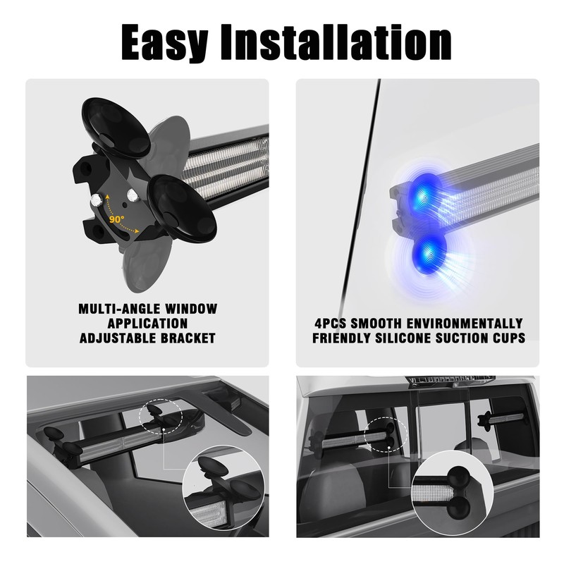 - Easy to Install: Equipped with 16 flash modes emergency light bar, a An 12v vehicle's cigarette lighter, 4 and 90° adjustable strong and stability suction cups brackets, 8 strong suction cups, and 134 inch long cable, you can easily install this led emergency for strobe on your in vehicles rear/front windshield and deck or dash installation and use.
