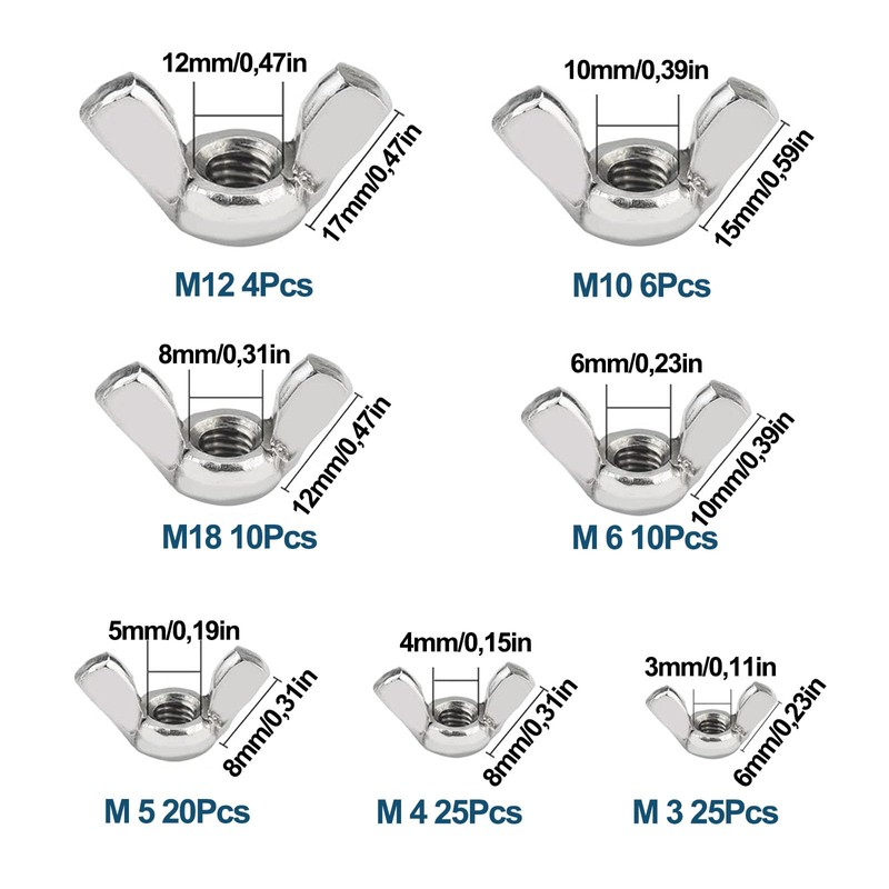 - Various specifications of wing nuts: from M3/M4/M5/M6/M8/M10/M12, 7 kinds of specifications to meet different size requirements.