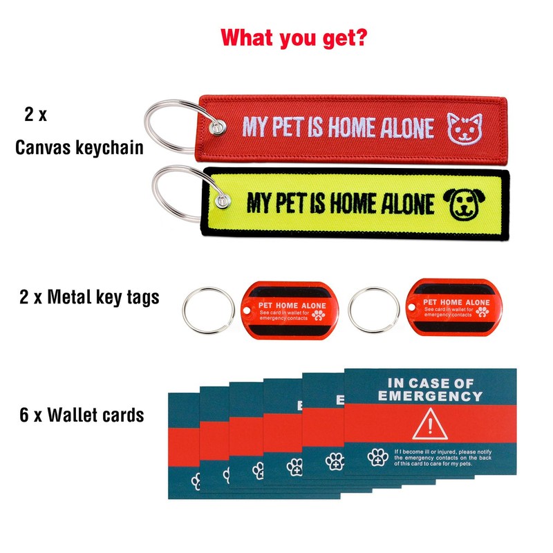 - Have you ever considered the situations in which you might sustain an injury while being away from home? In such cases, these keychains/key Tags can alert responders to contact your emergency contact(s) and inform them that you're injured and your pets are home alone.
