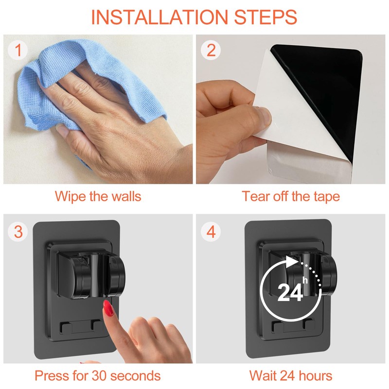 - Precautions during installation: After you tear off the shower holder film and attached to the wall, press it firmly and evenly for a time to ensure that the adhesive surface completely adheres to the wall. After completing the installation, please wait at least 24 hours before installing the shower head to ensure that the gel is fully cured.