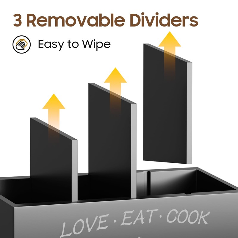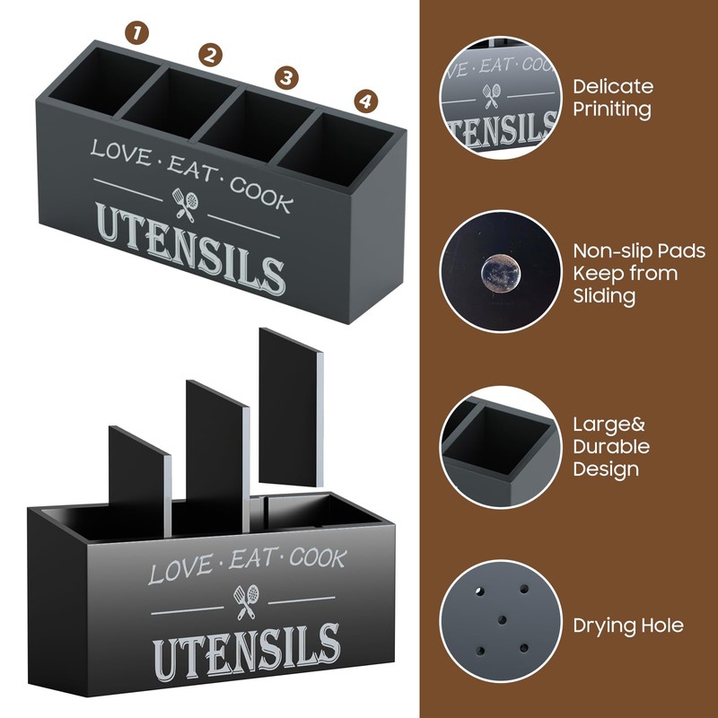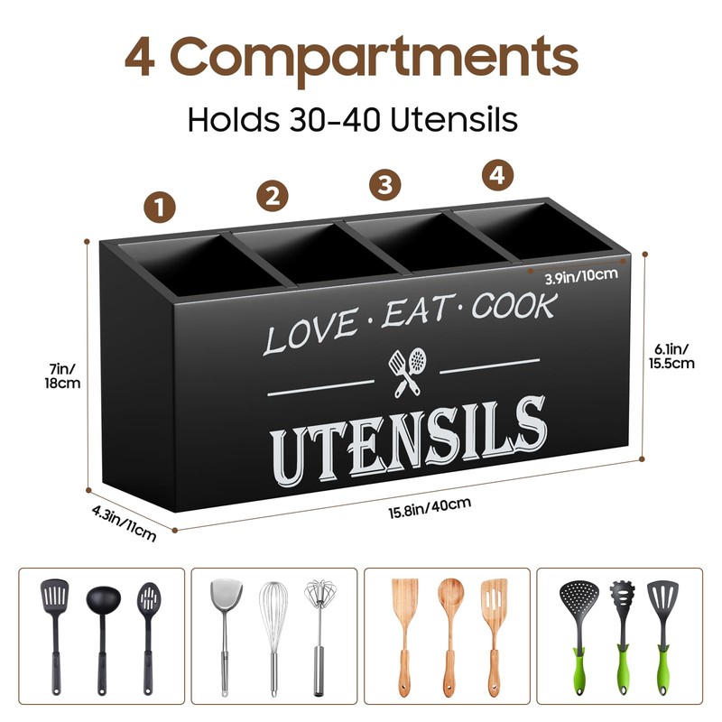 - Our Bamboo utensil organizer has 4 compartments. Large, roomy and pretty. Easy to grab utensils. Size:15.74"L x 5.9"W x 7.08"H. You can store all of your cooking tools easily and neatly. The rectangular shape can fit in nicely against the wall. A nice kitchen decoration!