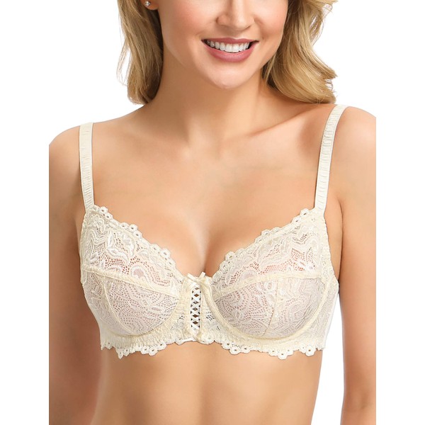 WingsLove Women's Full Coverage Non-Padded Bra Soft Cup Floral Lace Underwire Bra (Champagne, 34DD)
