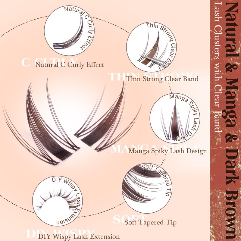 - --You will get 144pcs natural wispy lash clusters brown with 8-16mm size. Ultra natural cluster lashes with clear band design show manga anime eyelash extensions like in salon. Dark brown eyelash clusters are good for people who have brown, blond, red or other light color hair and eyebrows.