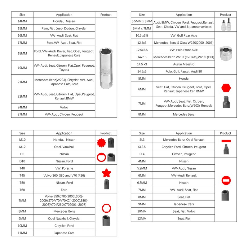 • This shock absorber tool set is compatible for Austin Maestro, Mercedenz Benz W203(C-class),W209(CLK), Honda/Nissan, Seat, Renault/Peugeot, SKODA, Ford, opel/ Vauxhall, chrysler, Audi and etc