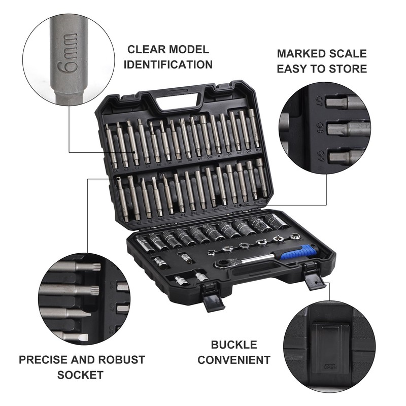 • 50PCS Nut Socket Set Includes: 29x counterholding bit (Spline: M10, M12; Hex Male: 5, 6, 7 & 8 MM; Hex Female: 7, 8, 9, 10 & 11 MM; Torx: T40, T45, T50 & T60; Slotted: SL3, SL3.5 & SL4; Type “D”: D5 & D10; Oblate Female: 4, 5.2, 6, 6.3, 7, 8, 9, 10 & 12), 2x strut spreader (5.5x8mm & 5x7mm), 6x strut nut socket (10.5x3.5, 12.5x3, 12.5x3.5, 14x2.5, 14.5x3 & 14.5x5), 10x socket (14, 15, 16, 17, 18, 19, 21, 22, 24 & 27 MM), 2x socket adapter (10mm x 3/8" & 10mm x 1/2"), 1x Pass-Thru ratchet