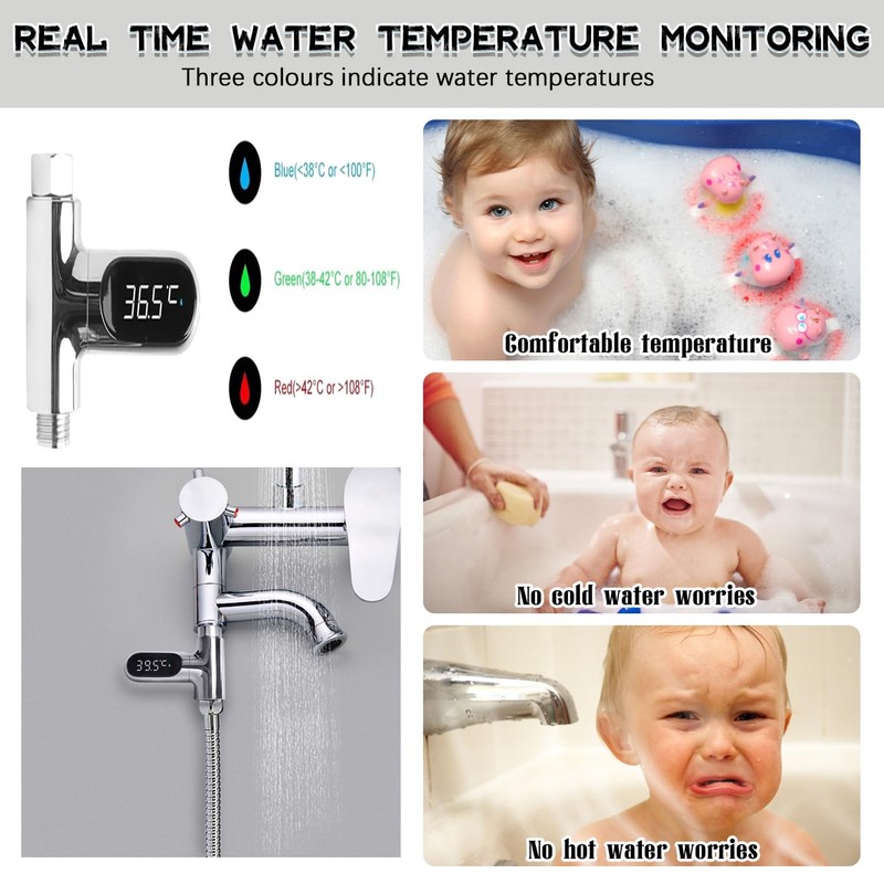 - 3Color indicator lightThis upgraded water temperature thermometer baby has red, green and blue indicator lights.When the water is at the right temperature, the light turns green. If the water is too hot, the light is red; if the water is too cold, the light is blue.Monitoring the shower temperature in real time.So you don't have to worry about the water being too hot and scalding your baby or too cold and making your children feel cold.