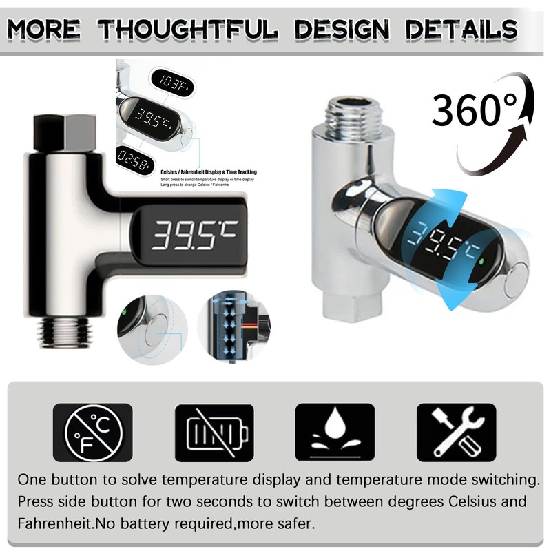 - 360 Rotating screenThis shower thermometer boasts a 360 rotatable LED screen for an unbeatable visual experience and easy observation of the water temperature. Best of all, it uses water flow power to generate electricity without batteries, which is so much safer.
