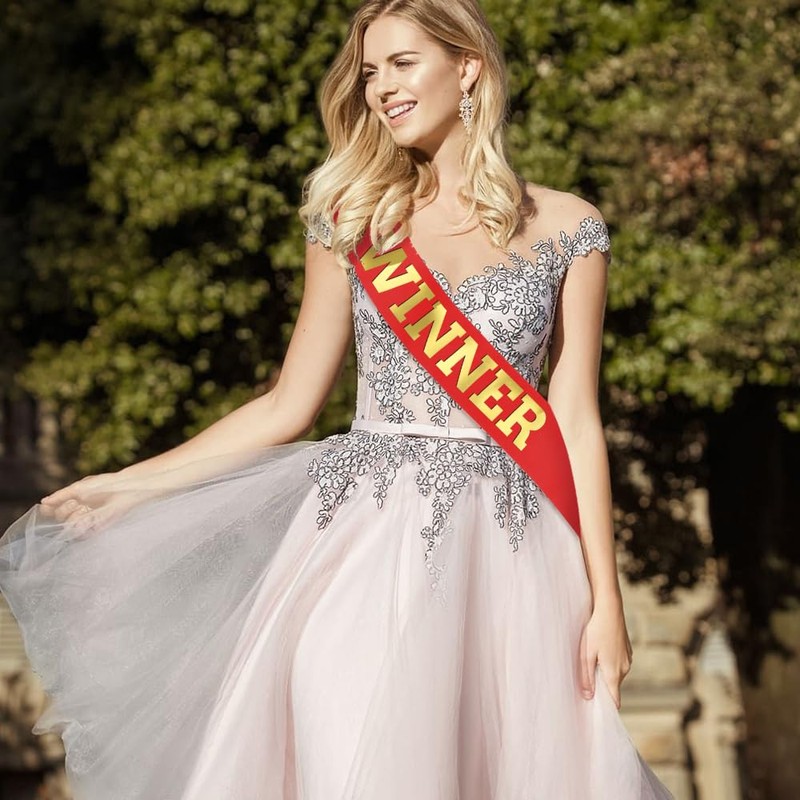 • The package includes one size fits most adults shiny satin sash. This bright Red satin sash features gold trim and "Winner"