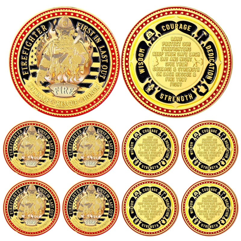 - Exceptional Features: our firefighter coins showcase 10 firefighting commemorative designs; Each coin bears rich and meaningful patterns, featuring the valorous principle of "first in, last out"; It's a poignant tribute to the courage of our fire service heroes