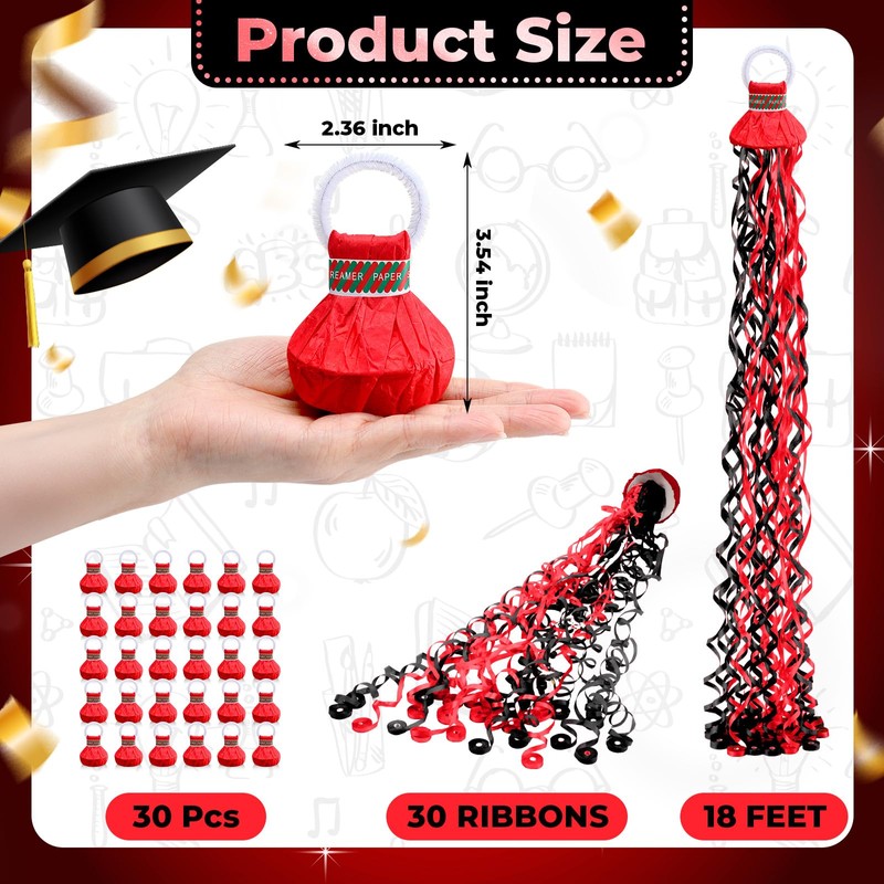- Package Includes: you will get 30 packs of hand throw streamers, each graduation party poppers have 30 ribbons in two colors, black and red, each ribbon is about 18 feet long, it will create a romantic effect when tossed and scattered, making your graduation party an unforgettable event