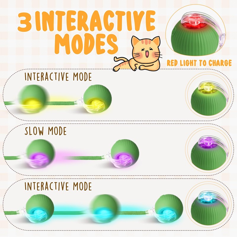 - Three Working Mode: electric rolling pet toy ball has three working modes: fast mode (blue) scrolls quickly on the ground, slow mode (purple) moves slowly on the floor, and interactive mode (yellow) to move at irregular intervals; Long press the power button to start its operation, short press to switch between working modes