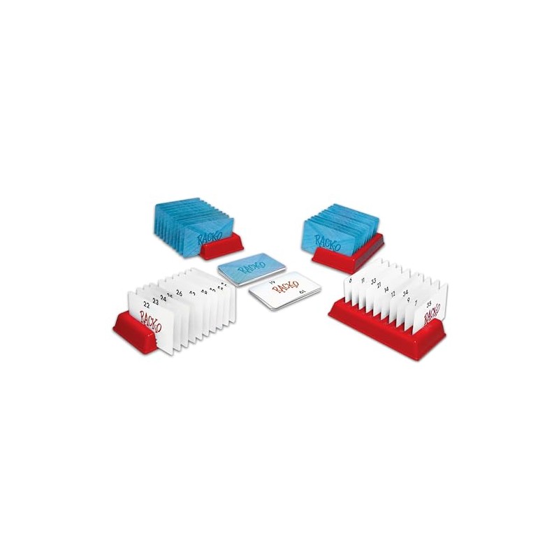 Rack-o was originally released in 1956, and since then families have enjoyed this Rack'Em & score fun-filled card game. This new addition, featuring fine quality cards with bold numbers, will delight players young and old. Rack-o is timeless fun. Players randomly slot 10 cards on their rack. The race then begins to draw and discard until one player positions 10 cards in numerical sequence from low to high. Sound simple? it is - but you will need skillful play, concentration and just a little luck to win. We include a deck of (60) playing cards, (4) plastic rack-o racks and instructions. Recommended for ages 8+, 2-4 players.