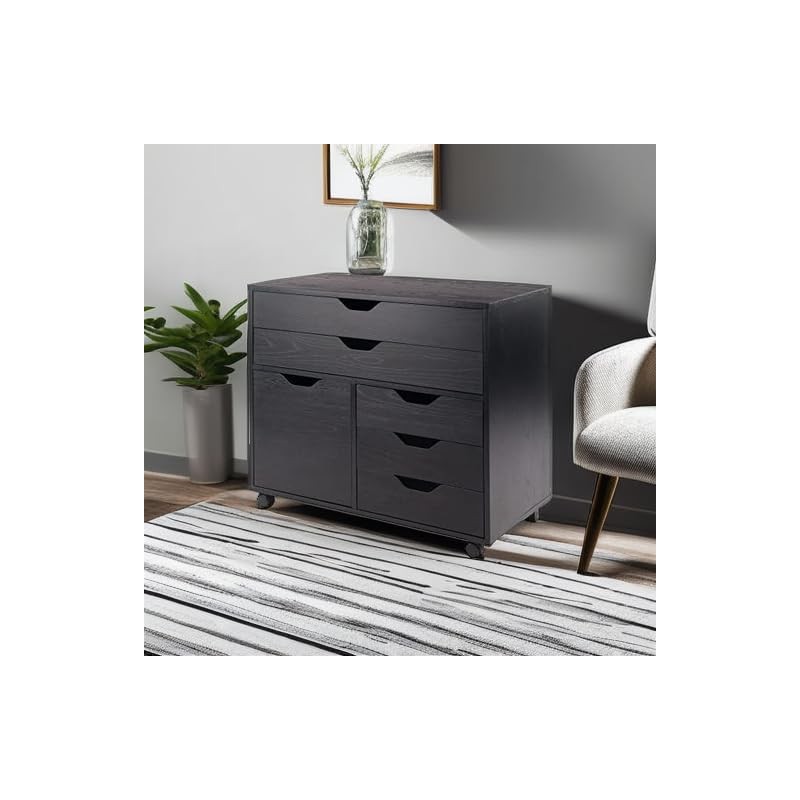 The Winsome Halifax 3-Section Mobile Storage Cabinet is ideal for all of your storage needs. With its clean, simple design, you can use it anywhere. It's the perfect organizer for your knitting, sewing, or craft supplies. Rejuvenate your garage space, mud room, or shed while providing much needed space to keep tools or sports gear organized. Or use it in a walk-in closet to expand your storage for clothing, linens, handbags and other accessories. This Halifax Cabinet features five gliding drawers with cut-out handles for easy access. The large drawers have interior dimensions of 27.5"W x 11.7"D x 2.56"H, just the place for artwork, maps, or clothing items you'd prefer to store flat and lengthwise. Three smaller drawers with interior dimensions of 13.2"W x 11.7"D x 2.5"H provide additional storage space, and taller items such as boots or backpacks can be kept in the side cabinet. The unit has five wheels, two of which lock, for easy mobility as well as a way to keep it securely in place. The Cabinet is made of sturdy composite wood in a contemporary black finish that will blend with any decor. For additional storage, combine the 3-Section Cabinet with other organizers from the Winsome Halifax collection. This item conveniently ships in 1 box and is ready for assembly. Replacement part request can be submitted directly to the manufacturer within 60 days from date of purchase. Overall dimensions: 26.3"H x 30.7"W x 15.9"D Static weight capacity for top is 35 lbs. Large drawer inside dimension: 27.5"W x 11.7"D x 2.5"H - static weight capacity large drawer is 15 lbs. Small drawer inside dimensions: 13.2"W x 11.7"D x 2.5"H - static weight capacity small drawer is 12 lbs. Cabinet inside dimensions: 13.7"W x 14.7"D x 13.6"H - static weight capacity for cabinet is 25 lbs. 5 wheels, two of which lock Assembly required Ships in 1 box