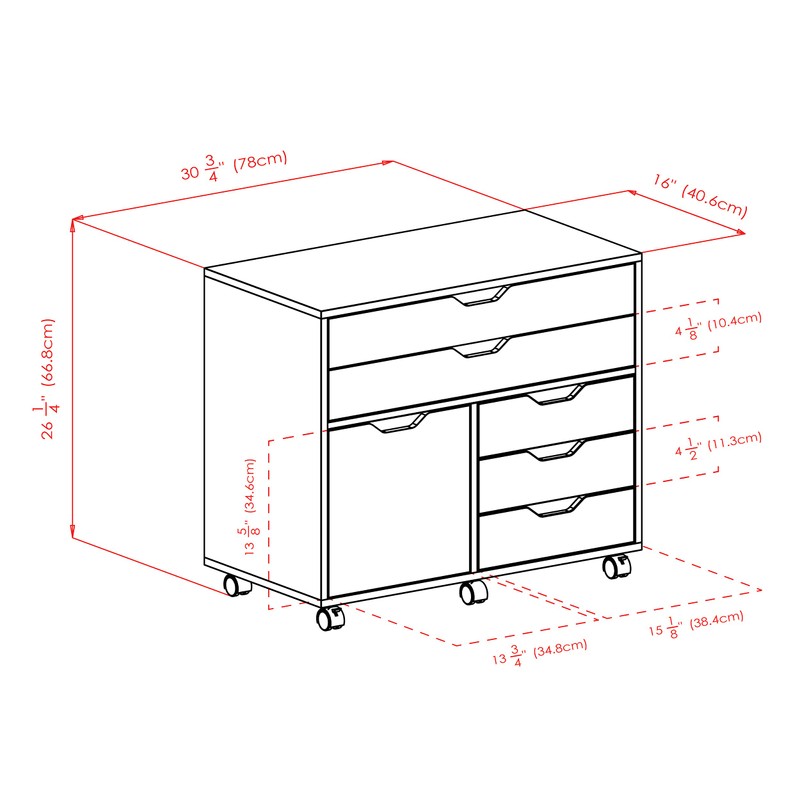 The Winsome Halifax 3-Section Mobile Storage Cabinet is ideal for all of your storage needs. With its clean, simple design, you can use it anywhere. It's the perfect organizer for your knitting, sewing, or craft supplies. Rejuvenate your garage space, mud room, or shed while providing much needed space to keep tools or sports gear organized. Or use it in a walk-in closet to expand your storage for clothing, linens, handbags and other accessories. This Halifax Cabinet features five gliding drawers with cut-out handles for easy access. The large drawers have interior dimensions of 27.5"W x 11.7"D x 2.56"H, just the place for artwork, maps, or clothing items you'd prefer to store flat and lengthwise. Three smaller drawers with interior dimensions of 13.2"W x 11.7"D x 2.5"H provide additional storage space, and taller items such as boots or backpacks can be kept in the side cabinet. The unit has five wheels, two of which lock, for easy mobility as well as a way to keep it securely in place. The Cabinet is made of sturdy composite wood in a contemporary black finish that will blend with any decor. For additional storage, combine the 3-Section Cabinet with other organizers from the Winsome Halifax collection. This item conveniently ships in 1 box and is ready for assembly. Replacement part request can be submitted directly to the manufacturer within 60 days from date of purchase. Overall dimensions: 26.3"H x 30.7"W x 15.9"D Static weight capacity for top is 35 lbs. Large drawer inside dimension: 27.5"W x 11.7"D x 2.5"H - static weight capacity large drawer is 15 lbs. Small drawer inside dimensions: 13.2"W x 11.7"D x 2.5"H - static weight capacity small drawer is 12 lbs. Cabinet inside dimensions: 13.7"W x 14.7"D x 13.6"H - static weight capacity for cabinet is 25 lbs. 5 wheels, two of which lock Assembly required Ships in 1 box
