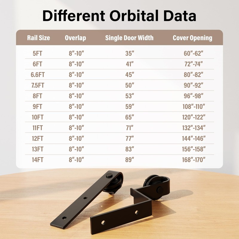 - [HEAVY DUTY STURDY AND SAFE] - High standard Premium quality carbon steels is applied to create most sturdy barn door hardware kit. The high quality steel, anti-scratch high temperature fine black powder coated surface and heavy duty 1/4" thick carbon steel rail and roller arms will last a long time, 8.8 grade Self-tapping screws and roller screws make our hardware kit can hold two 230lbs doors comfortably.
