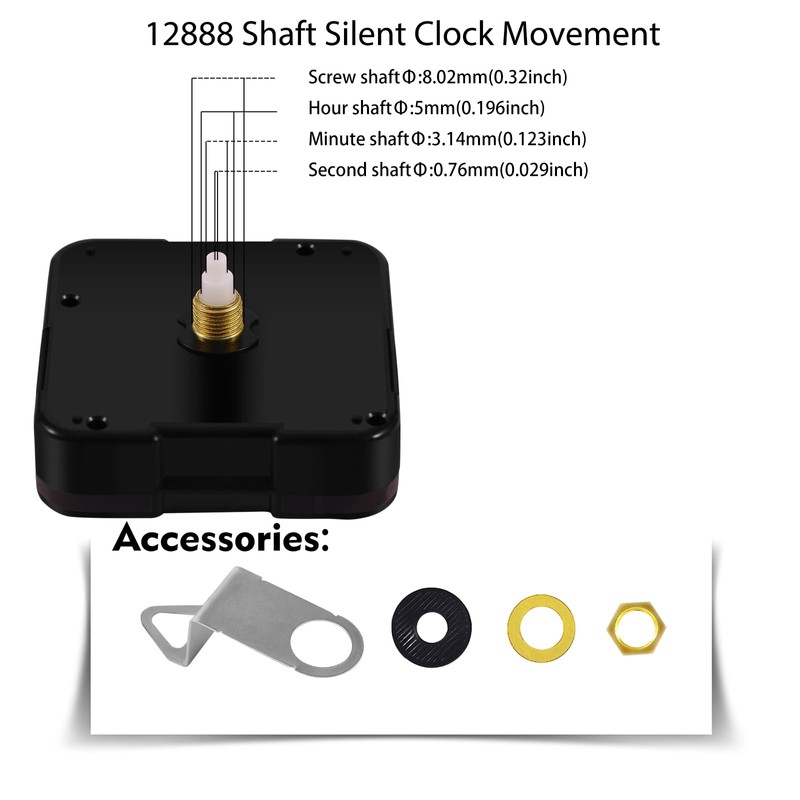 PACKAGE INCLUDES 1 set clock hands, 1 super quiet movement and accessories (1 x prostitute, 1 x rubber, 1 x washer, 1 x hex nut)