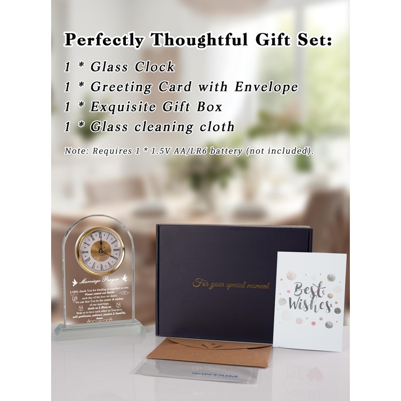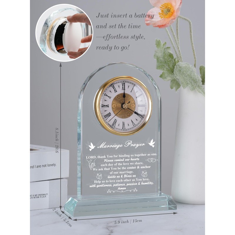 - WEDDING & ANNIVERSARY GIFT FOR COUPLE – Arch-shaped Marriage Prayer plaque gift glass desk clock with a whisper-quiet quartz movement and beautifully blessed, makes a heartfelt keepsake for spouses or newlyweds, from the very first day to golden anniversaries.