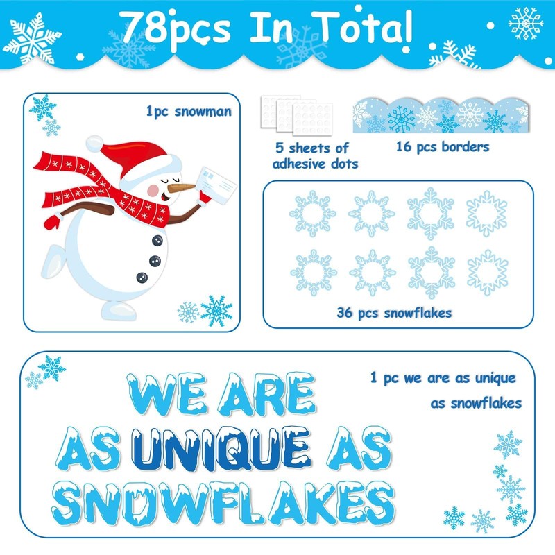 - Package includes: You will get 78pcs in total, 26pcs "we are as unique as snowflake" letter cards, 36pcs snowflake cards, which can stick kids photo, 1pc large snowman cards, 16pcs border trim and 5 sheets of glue points(20 of each sheet). Sufficient quantity and proper size for your classroom and home decoration.