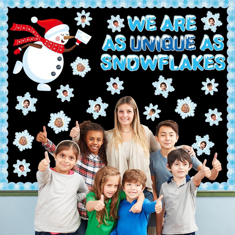 Snowflakes Bulletin Board Winter Snowflake Snowman Cutouts DIY Photo Crafts We Are As Unique As Snowflakes Classroom Decor for Winter Season Christmas Holiday Home School Window Wall Door Supplies