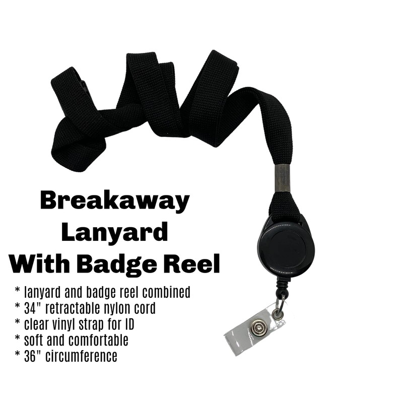 Lanyard with Badge Reel- The convenience of a retractable badge reel with the functionality of a lanyard, all in one. Comfortable to wear and has a soft spongy feel. 36" total circumference, hangs center chest. Retractable 34" nylon cord. Clear strap for your ID.