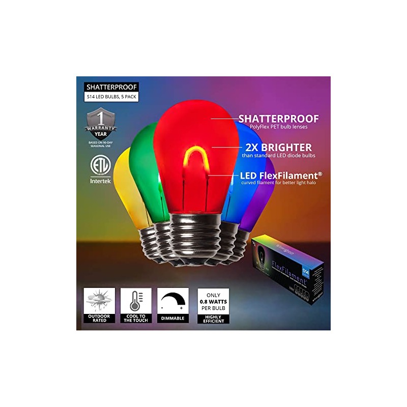 - Box of 5 multicolor shatterproof PolyFlex PET S14 LED filament bulbs in red, green, blue, gold and purple, E26 base. PolyFlex PET lenses are ultra-lightweight yet shatterproof, so they can withstand rough use and keep looking beautiful.